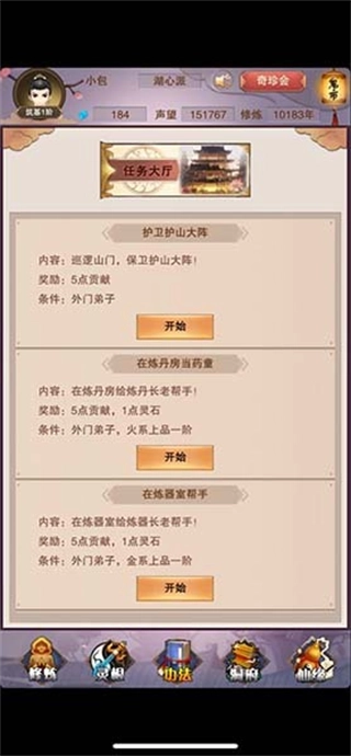 当灵根晋升至上品后,便能在门派中挂机完成门派任务,每隔10分钟可获得一次奖励。