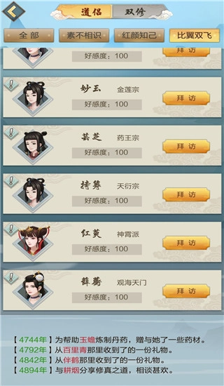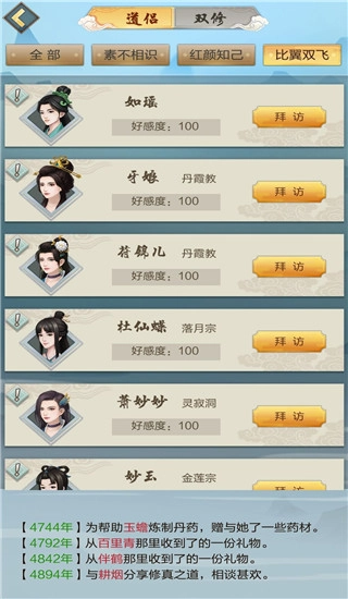 与自己中意的道侣进行双修,能够获取一定奖励。每一位道侣所具备的属性皆有所差异,这就需要诸位去加以了解。