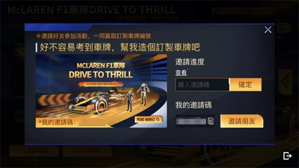 你还能通过邀请好友帮忙,来更新原有的车牌号码。点击活动右上角的【输入邀请码】按钮,就能向游戏内好友分享邀请码,若成功使用该邀请码,双方的超级车牌编号都将获得1次额外的更新次数!