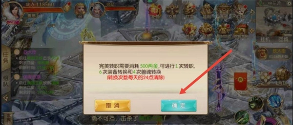 4、若选择“完美转职”,则需耗费500两金子,涵盖1次职业转换、6次装备转换以及4次兽魂转换。