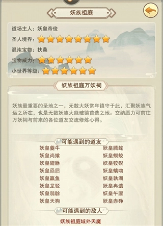 仙妖大战历史悠久,无数妖族被各路仙佛收为坐骑护法,造成了妖族仇视异类的传统,因此探索妖国危机四伏,必须地仙以上才能入内。