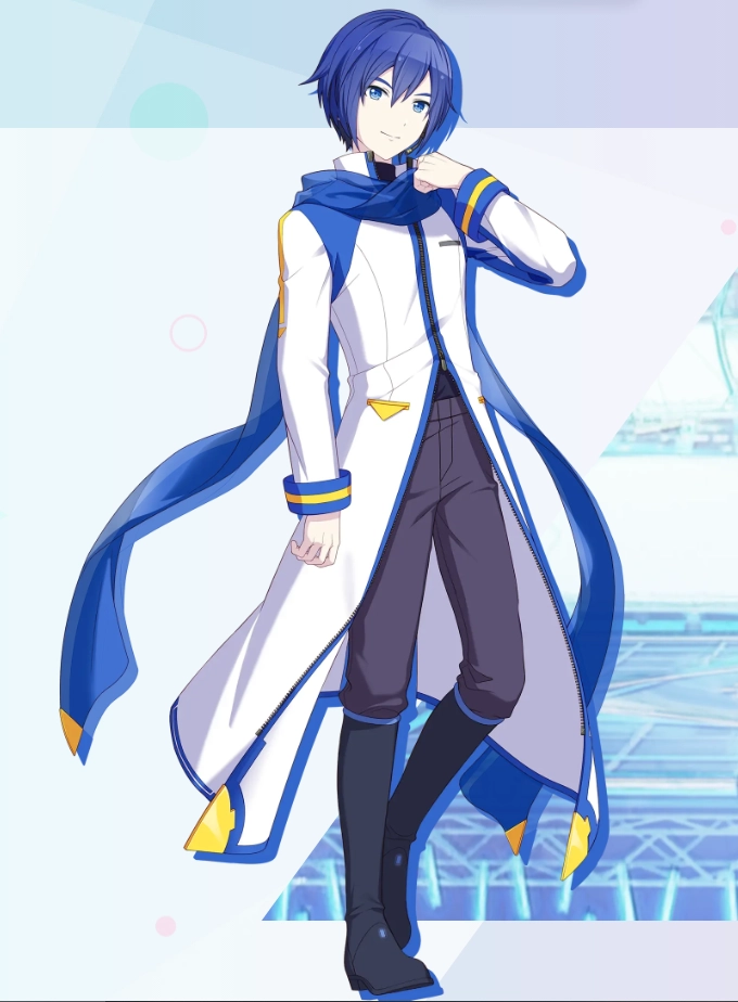 6、KAITO(カイト):有着深蓝色头发的男性歌手,身着蓝白相间的大衣和蓝色长围巾。他有清凉纯朴的歌声以及成年男性特有的厚低音。