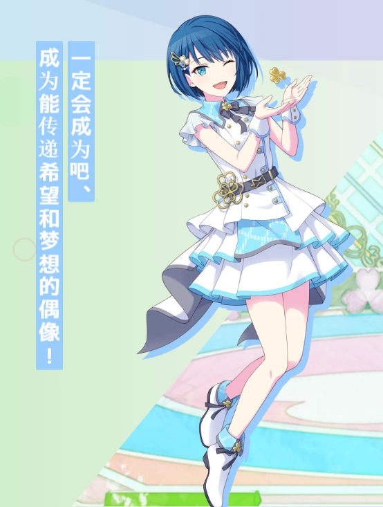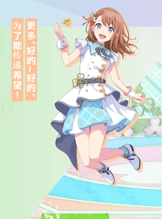 4、日野森雫:曾是人气颇高的偶像组合“Cheerful*Days”的原核心成员。尽管与昔日成员因不顺利退团一事产生过矛盾,但借着MORE MORE JUMP!首次共同登上电视节目的契机,双方关系稍有缓和,也在继续向前发展。