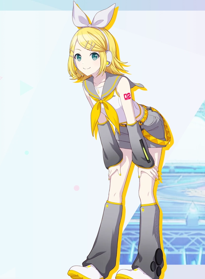 2、镜音铃:佩带一条大丝带的金发白肤虚拟歌手女孩,她具有迷人而活泼的歌声,和镜音连是双胞胎。