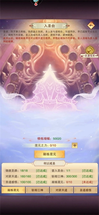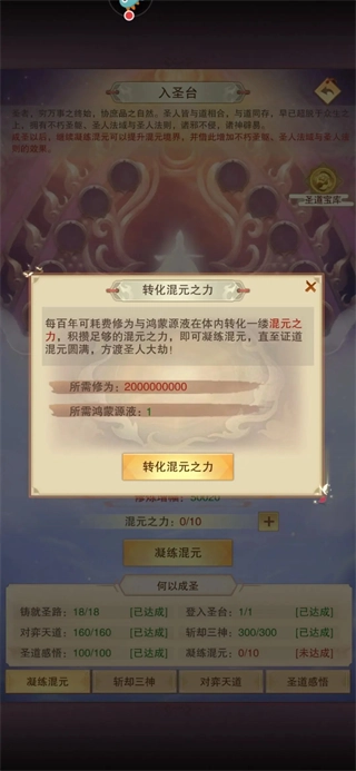 2. 最为钟爱的点化道果环节:当修为达到准圣之后,能够消耗1000点玄黄以及2点鸿蒙原液来对道果进行点化,点化后道果属性将会翻倍(此操作对道果本身的等级并无限制,无论道果是几级皆可提升,且提升效果一致)。