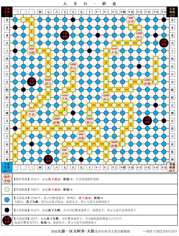 3. 对弈天道:达到准圣境界后,需花费1000玄黄购买书籍。此后,凡界与三界的随机地点会出现一朵小紫花。每日点击小紫花(无需进入相关地图),即可获得2个棋子,接着前往棋盘下棋即可。每集齐32缕机缘,就能得到一本天道秘诀,总计可获取5本。棋盘情况如下图所示。