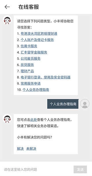 2、然后在智能客服的对话页面选择第10项,个人业务办理指南。