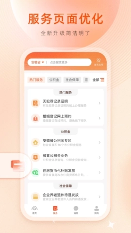 2、安徽事务通过一键快捷便捷服务、支持服务、生活服务、信息服务等帮助您更便捷的移动服务。
