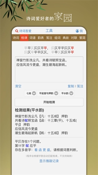 可以帮助用户学习和检测诗词是否符合押韵和仄的要求,能帮助你提升诗词的表达和造诣;