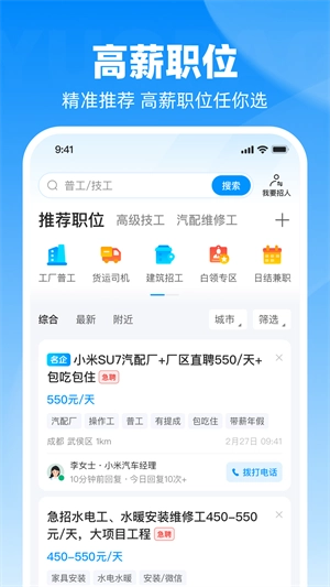 该软件可以给大家提供各种蓝领的工作,招聘的行业也非常的多,覆盖诸多的行业,企业和老板都是实名认证的,给大家提供超多工作机会。