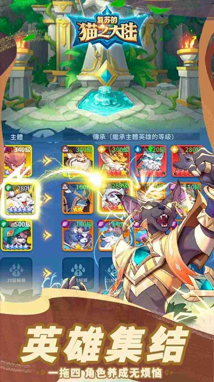 1、收集六大阵营近百位猫族英雄,升级、进阶提升实力,搭配出强力阵容。