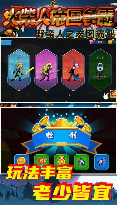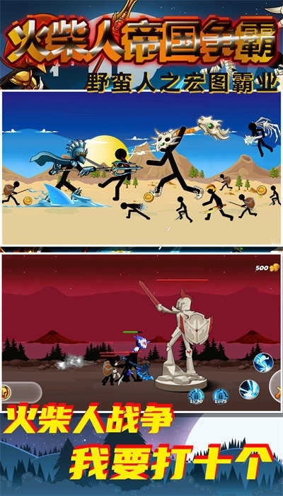 1、别具一格的火柴人风格,游戏画面简约清晰,有着丰富多样的火柴人战士与武器,每位英雄皆具备独特的技能和属性。