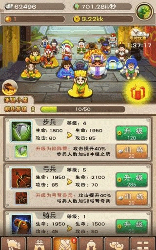 兵种升级:在兵营界面我们可以升级兵种。兵种是作战的主力,三个兵种各自都有特色:骑兵擅长突进,秒弓兵秒武将就靠他了;步兵较为平衡,提供稳定的DPS也是一个不错的肉盾;弓兵可以远程输出。就目前小编了解到的而言,主要有两种升级方法:一是主力升级骑兵,钱不够升级骑兵了再升级步兵和弓兵。这种升级方法就是秒兵,秒将快;二是平衡升级,让三种兵都有一定的作战能力。
