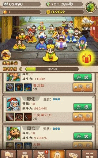 武将系统:在武将界面可以提升武将的等级。一,与兵种相比武将一个巨大的优势就是攻击力高。于此同时战斗时小兵还不怎么喜欢打武将,因此提升武将等级可以很快的提高DPS。二,每一个新解锁的武将都有很高的初始等级。所以玩家们要尽快完成一个州的攻占哦。另外游戏中还有武将计的设定,每个武将都有各自的武将计,不过这个武将计暂时只能花钱购买。