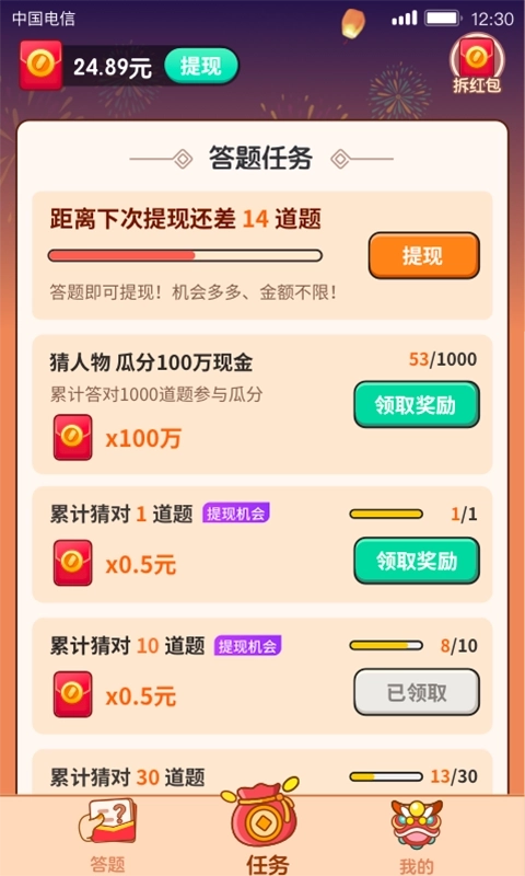 2.拿钱小技巧:邀请人一起玩,填好你的推荐码,你与盆友都能得到一个复生机遇,答错1题都不危害拿钱!