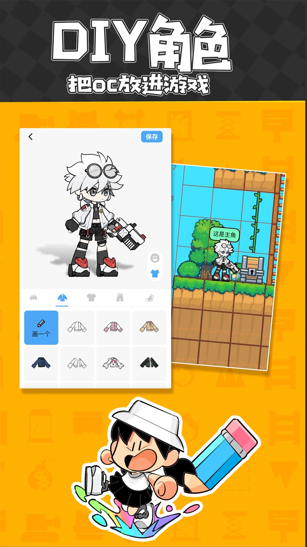 只需要简单的几步,画完的角色可以动起来;无论是音乐、场景、机关、武器、人物都可以根据你的想象做出来