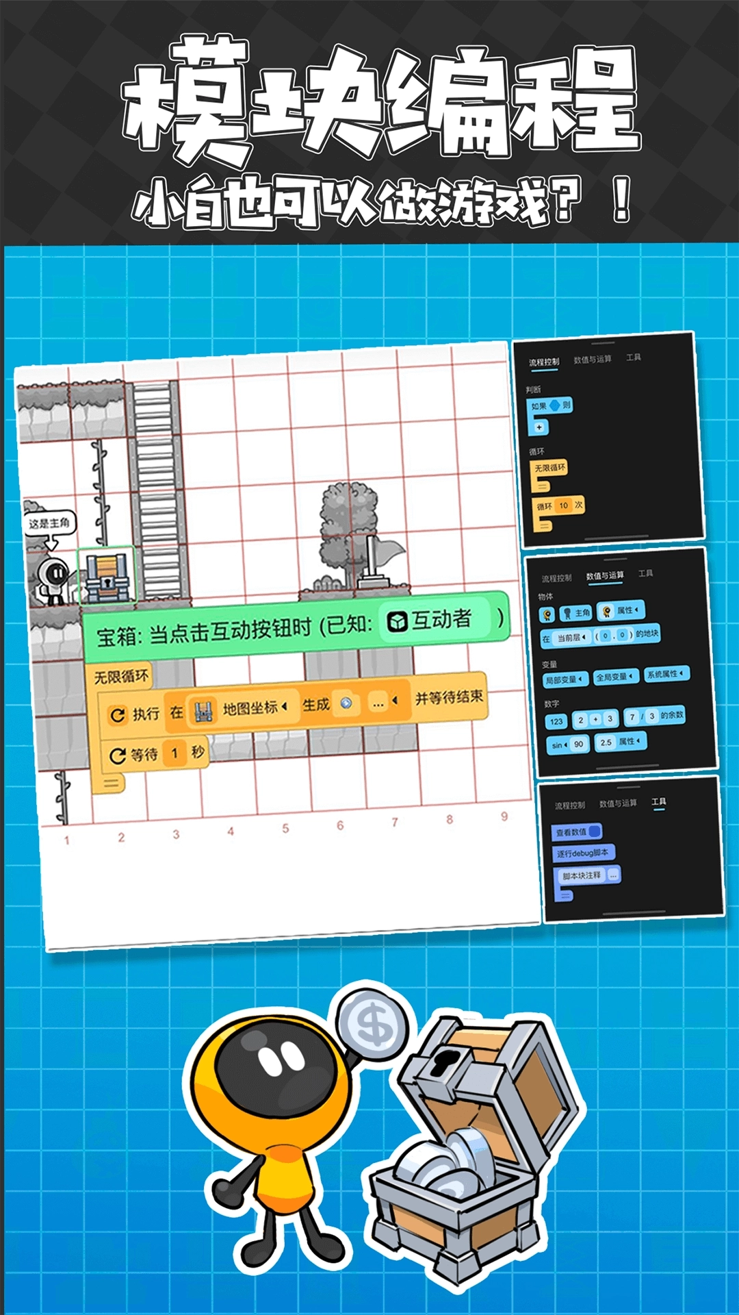 3.图形化编程脚本的方式,随意制作自己想要的作品,无论是动画动漫,还是互动游戏等