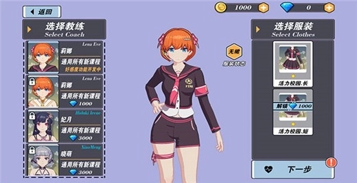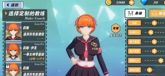 1、定制界面呈现如下,用户能够依据自身喜好,对教练角色的体型、脸型、服饰等进行设定。