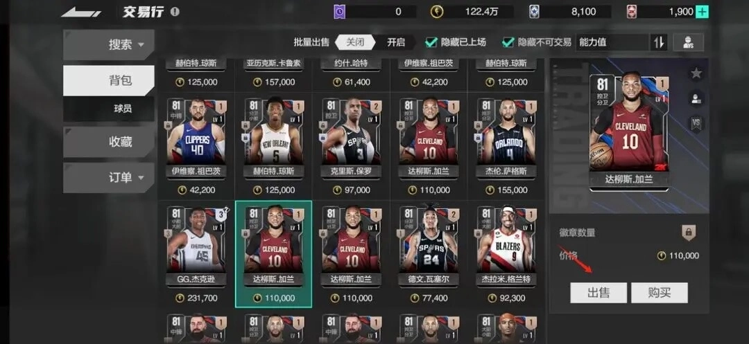④背包上方可以开启批量出售,选中不同的球员同时上架出售,提高效率