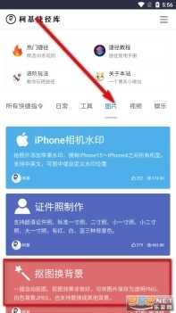 2、在位于柯基捷径库“图片”栏目,找到红色方框选中的“抠图换背景”。