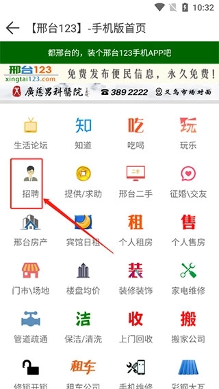 1. 于本站下载邢台123手机版,开启软件进入首页,点击【招聘】选项。