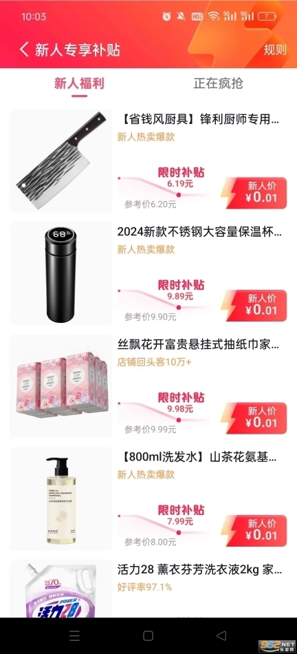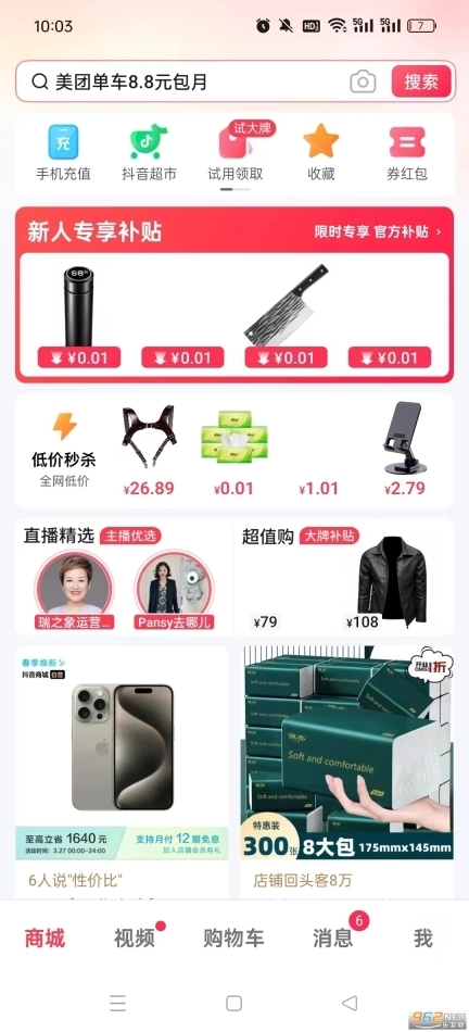 值得留意的是,原本在抖音中排序相对靠后的“低价秒杀”,其优先级显著提升。像0.01元的纸巾、0.01元的菜刀、1元的手机壳等商品,配上简洁直白的“已补贴xxx元”标注,价格大多都在10元以内。反观原先的“直播精选”“超值购”,都被排在了“低价秒杀”之后,而“品牌馆”更是直接从首页消失不见。
