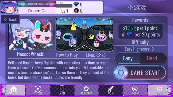 这个小游戏采用类似打地鼠的模式,Bella、Usalina以及鸭子会从界面里DJ工作台上左右两个碟子里的6个孔冒出来。