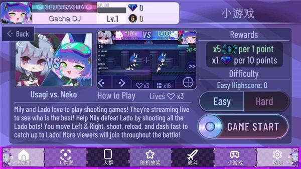 在这个小游戏中玩家需要操控界面上代表Mily的准星,左右移动或冲刺来射击出现的代表Lado的敌人。