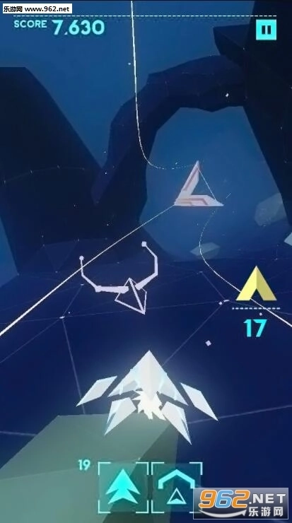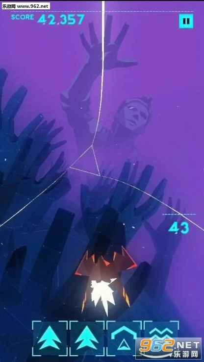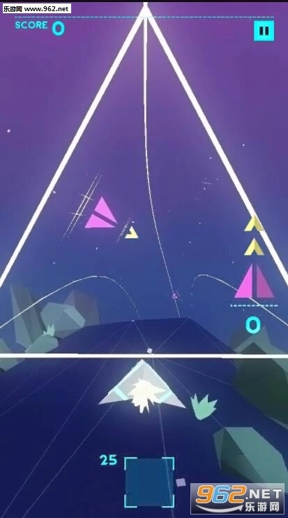 操控小型飞船,在飞行过程中,要吃掉不同颜色的三角块,同时躲避或冲破障碍物。界面右侧会展示两个目标颜色的三角块。飞船运行在三角形轨道上,能够通过左右滑动来切换轨道,向前滑动则可撞破三角墙。这主要考验玩家的反应能力。