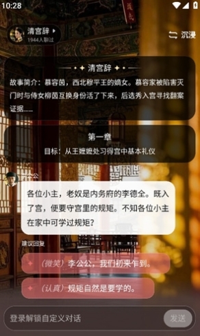 应用提供了丰富的剧本供用户选择,用户可以根据自己的喜好挑选剧本,并与虚拟角色进行互动。这种互动结合了文字冒险和角色扮演的元素,让用户能够沉浸在故事情节中,体验不同的角色和人生。