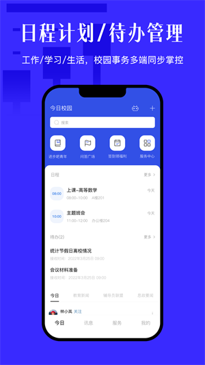 今日校园是江苏金智教育信息技术有限公司旗下的一款面向高校师生的移动校园平台。它以校园组织为核心,通过提供全场景服务聚合和校园组织协同能力,打造 “与师生并肩” 的智能办公、学习、生活方式。