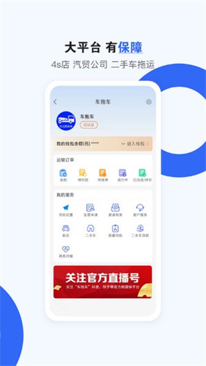 车拖车是一款专业的汽车托运服务平台类软件,具备方便快捷的特点,能够实现全国上门提送服务,而且可以适配全系车型和各种车辆状态,能很好地保护车辆在运输过程中不受损伤。