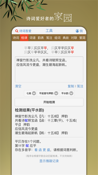 点击“检测”按钮,系统将自动分析诗词的押韵情况,并给出详细的检测结果。