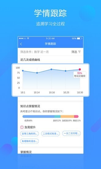 追踪历次考试信息,精细分析学生知识掌握的优势、缺陷和认知能力水平。