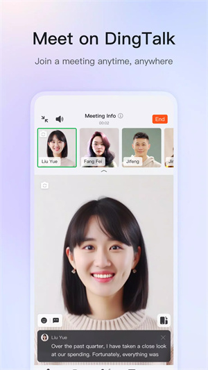 自动匹配发言人字幕:DingTalk会议可精准定位多人会议中的发言人,让观点碰撞清晰有序,同时实时识别会议语音并呈现字幕,嘈杂环境或出差路上也能及时看到讨论内容,随时随地,流畅开会。