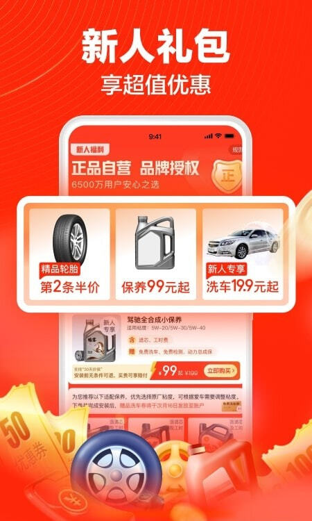 新人小保养99元起,限时下单送洗车;轮胎专享新人96折,大牌轮胎第二条半价,电瓶最快30分钟上门装。
