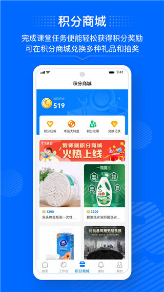 6、教师学院,积分商城:平台设有教师学院,提供系统培训教程和提升课程供老师学习使用;设有积分商城,老师每天完成课堂任务便能轻松获得积分奖励,可在积分商城兑换多种礼品和抽奖。
