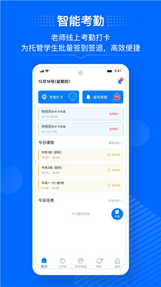1、线上考勤打卡:老师通过教师端可做线上考勤打卡、学生考勤批量签到签退、请假等 ,操作简单,高效快捷。