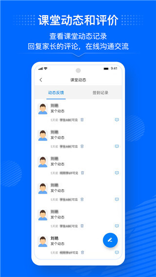 2、智能动态:老师在当日托管课后发布学生课堂动态,入托前和托管结束后,老师的签到签退信息也会通知到家长,方便家长随时了解孩子的托管情况,也可在线评论,沟通交流等。