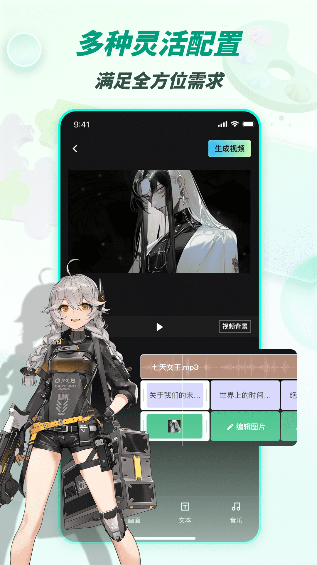 2、支持添加背景音乐,内置了多种音乐素材,用户可以为自己的视频添加背景音乐;