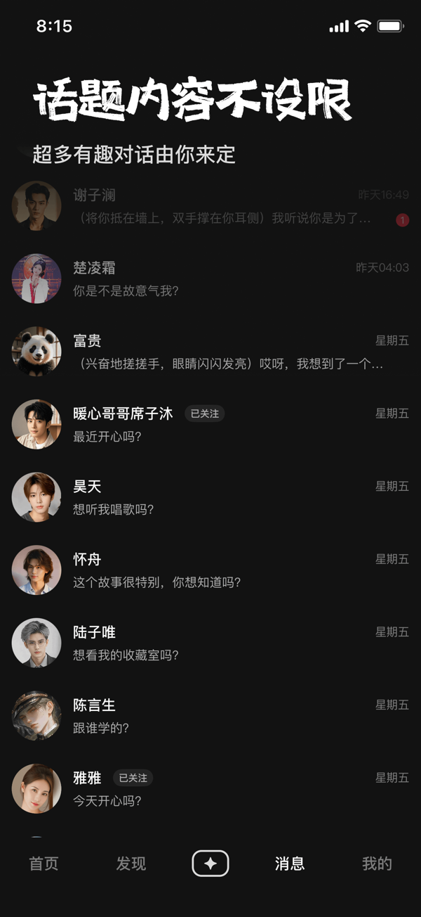 影视八卦、星座玄学、哲学脑洞…聊什么你说了算!超多有趣对话由你来定。