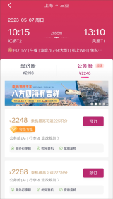(3)选择完成后,进入该航班订票页面,选择经济舱或是公务舱机票,选择完成点击【订票】;