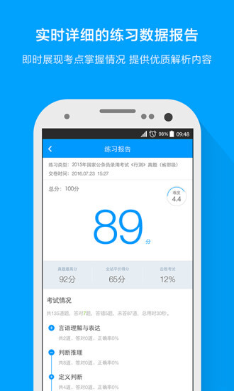 2、个性化出题,精准预测:依据目标考试的考点、考频及难度,借助人工智能算法达成一对一智能出题;通过记录用户的练习状况,生成能力评估报告,进而精准预测考分。
