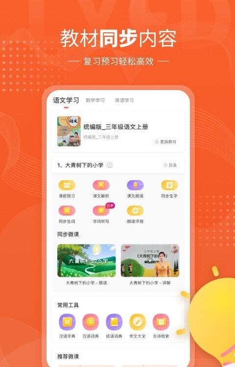 鲤鱼辅导还提供教材朗读、同步生字、同步生词、思维导图、学习笔记、同步微课、课后练习、朗读评测等全流程辅导资源。英汉词典、汉语字典、成语词典、小学作文、古诗检索等辅导工具一应俱全,让孩子同步学+同步练+同步查,构建学习闭环。