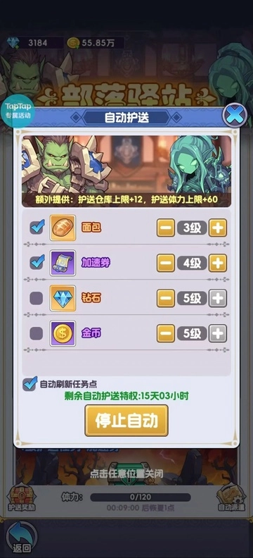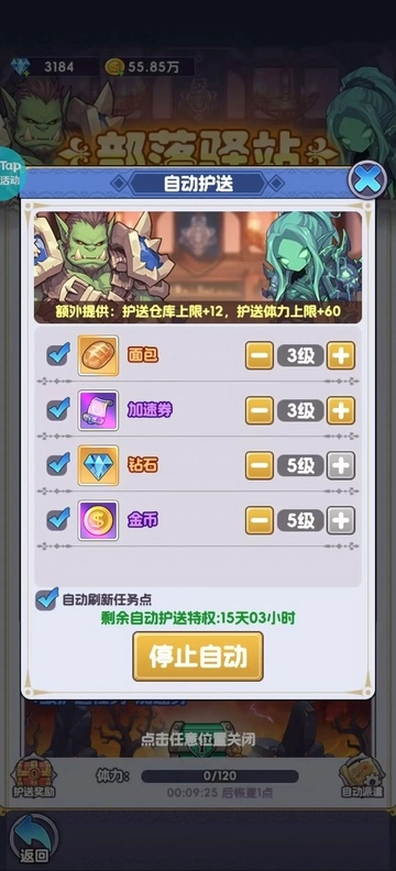 零氪以及微氪玩家推荐3355护送设定,保障面包以及加速的同时,挂5级的金币和钻石,可以得到两者平稳获取的效果,在声望升级时候不至于因为金币卡住节奏。