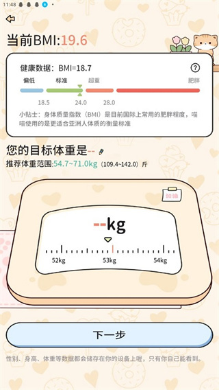 2、输入完成后,可通过当前界面了解健康数据,包括你要完成的目标体重;