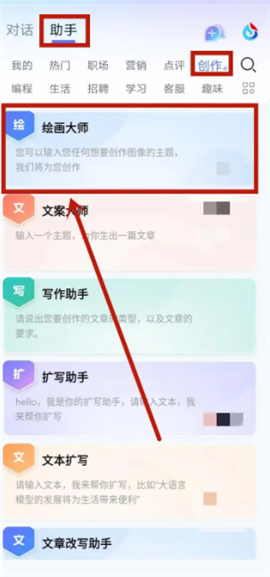 1. 在讯飞星火app界面,轻点左上方的助手,然后挑选绘画大师这一项目。