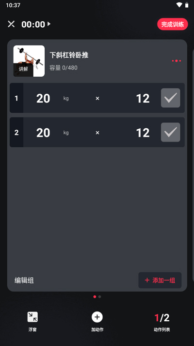 4、添加完成后在编辑页设置锻炼量,最后点击完成训练就可以了