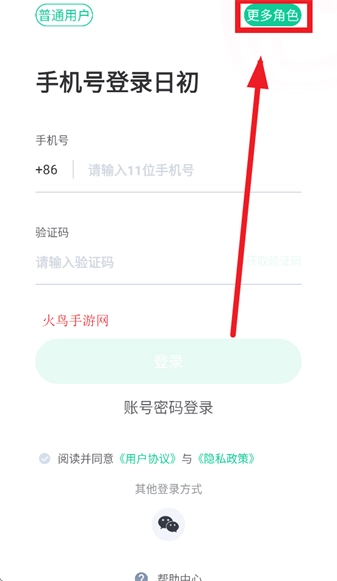 首先下载并安装日初app,安装完成后打开该应用。当进入到登录界面时,点击界面上的“更多角色”选项。