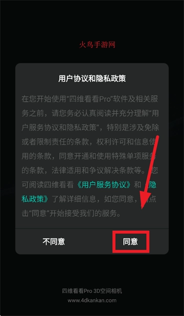 首先下载并安装四维看看pro,安装完成后打开该应用,进入应用时需先同意用户协议与隐私政策。